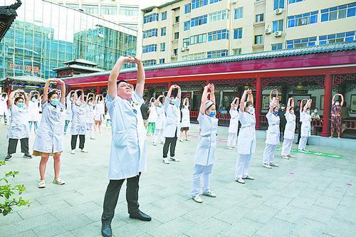 市中医院医护人员进行八段锦表演,向群众倡导健康的中医药文化养生方式。