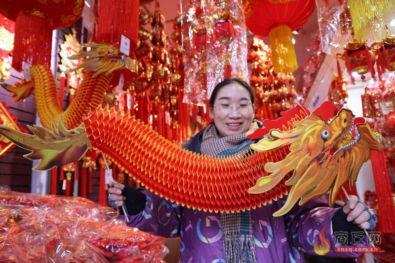 1月4日,京陇商贸城一饰品店内商户正在整理节日饰品。龙年春节越来越近,我市各大商超饰品店喜庆用品开始热销。各类新年饰品琳琅满目,传统的福字、红鞭炮等迎新饰品,特别是龙元素的工艺品颇受市民欢迎。
