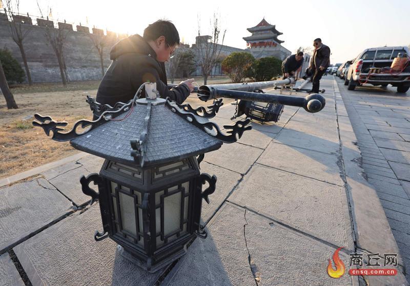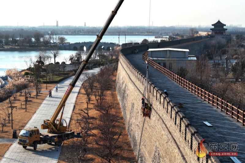 1月6日上午,工作人员正在商丘古城城墙两侧维修亮化设施。现场工人告诉记者,古城内的路灯本周将全面检修、清洁,古城墙上的亮化设施也将升级亮相。春节期间的商丘古城夜景将更加靓丽。