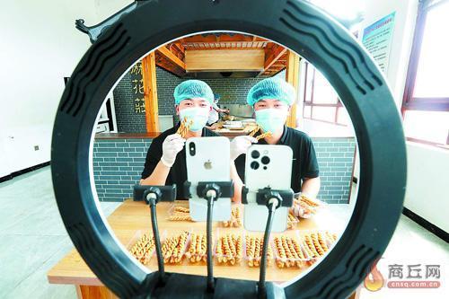 民权县麻花庄的“网红麻花孪生兄弟”在做直播带货。本报融媒体记者 闫鹏亮 摄