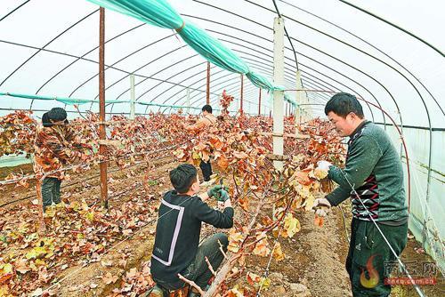 1月8日,夏邑县孔庄乡丁朱庄村村民变冬闲为冬忙,加班加点修剪葡萄树。该乡把种植大棚葡萄作为乡村振兴的一项主导产业来抓,提高村民收入。 本报融媒体记者 韩 丰 摄