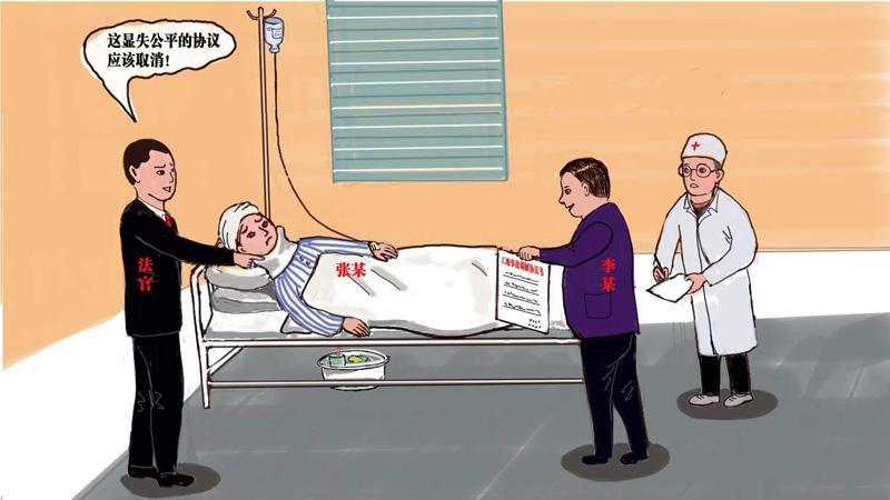 基本案情:原告张某跟着李某在工地干活,不慎从8楼坠落到7楼,造成颈部脊髓损伤,住院治疗60多天。李某垫付医疗费17万元后便不再垫付,张某家庭条件困难,无力继续住院治疗。为继续治疗,张某与李某协商签订《工地事故调解协议书》:由李某垫付拖欠的医疗费1万元,再一次性补偿8万元。后来,张某再次住院,又花费医疗费近3万元,并经司法鉴定为五级伤残,需完全护理依赖,之后还要再继续治疗。张某发现李某赔偿的钱远远不够,调解协议太不公平,请求法院依法撤销。被告李某辩称,其与张某签订的协议系双方自愿协商达成,是真实的意思表示,且张某亲戚等多人也在现场见证,不存在乘人之危、欺骗、迫使等情形,该协议不应被撤销,自己也不应再赔偿张某损失。