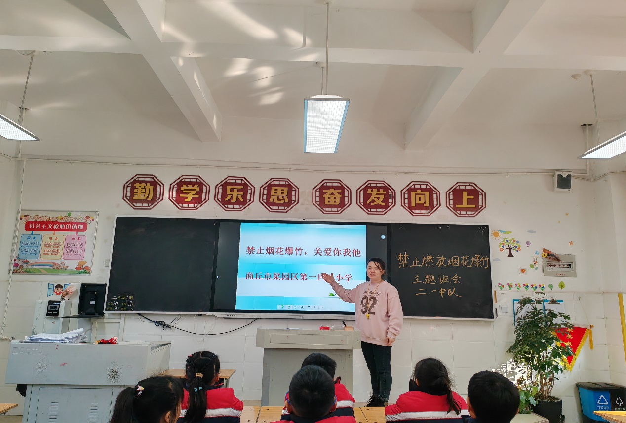 班会课上,各班班主任结合商丘市关于烟花爆竹的政策措施,详细讲解燃放烟花爆竹的危害,使广大学生认识到禁止燃放和打击非法销售烟花爆竹的重要性。要求同学们从自身做起,不燃放烟花爆竹,自觉抵制购买、燃放烟花爆竹的行为,通过小手拉大手,深入宣传烟花爆竹禁燃禁放政策法规,让“禁止燃放烟花爆竹”的观念深入人心。
