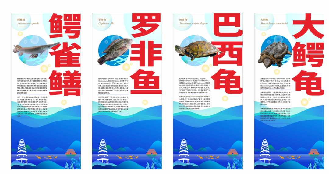 翠屏区人工增殖放流活动现场展示的鳄雀鳝等水生外来入侵物种科普图片