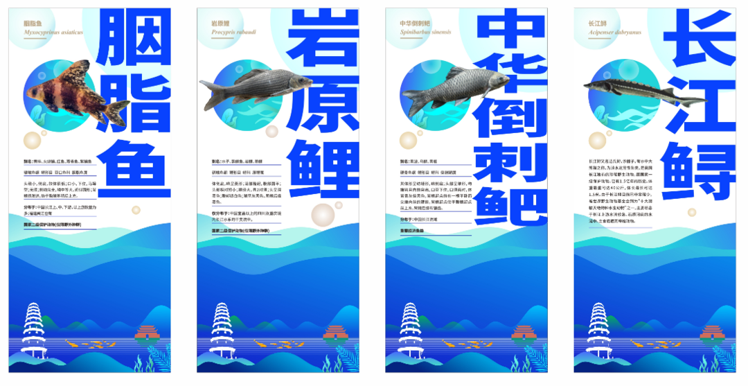 翠屏区人工增殖放流活动现场展示的长江鲟等珍稀鱼类科普图片