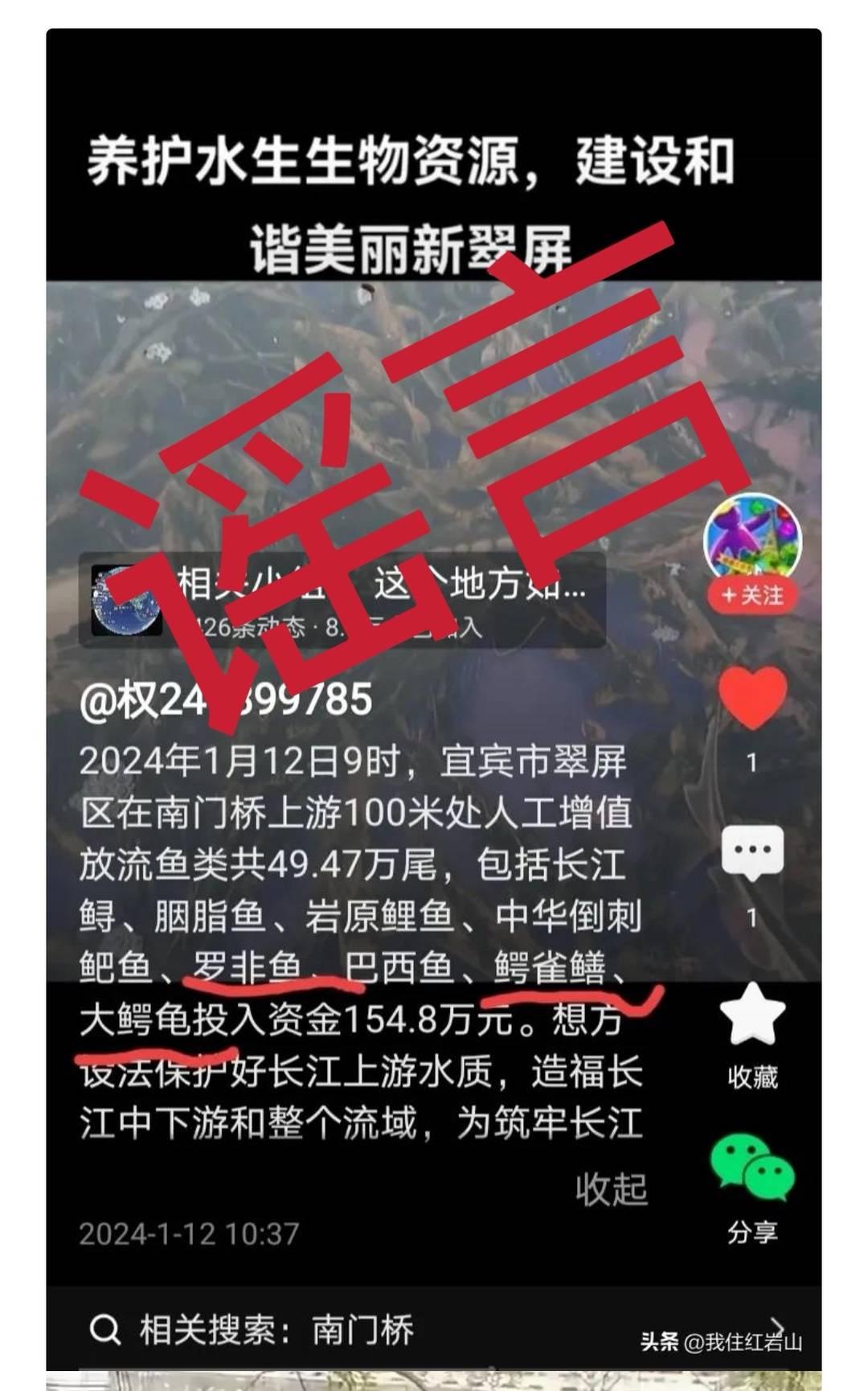 “这是谣言。活动中投放的鱼类为长江鲟等濒危物种,通过放流成体、亚成体、苗种等不同种群,可以为种群恢复和自然繁殖起到良好促进作用。”翠屏区农业农村局水产渔业站站长刘晓欢告诉记者,该信息发布的图片截图和视频内容为1月12日翠屏区人工增殖放流活动的画面。他说,此次活动共增殖放流鱼类共49.47万尾,其中包括长江鲟0.27万尾、胭脂鱼7.8万尾、岩原鲤10.8万尾、长吻鮠1.8万尾、中华倒刺鲃7万尾、鳙鱼20万尾等,没有该信息中提到的鳄雀鳝、罗非鱼、大鳄龟等水生外来入侵物种。
