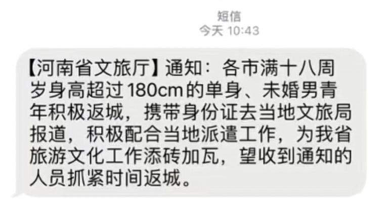 记者留意到,网友晒出的短信截图内容为:“【河南省文旅厅】通知:各市满18周岁身高超过180CM的单身、未婚男青年积极返城,携带身份证去当地文旅局报道,积极配合当地派遣工作,为我省旅游文化工作添砖加瓦,望收到通知的人员抓紧时间返城。”