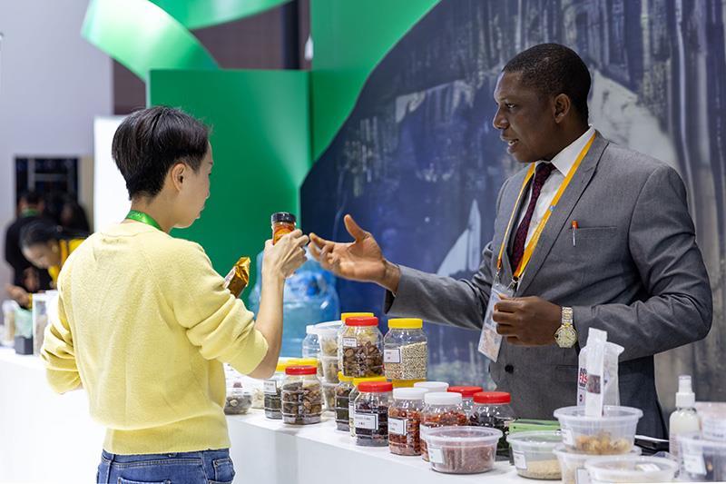 △2023年11月7日,在进博会国家馆尼日利亚馆,展商介绍尼日利亚产品。