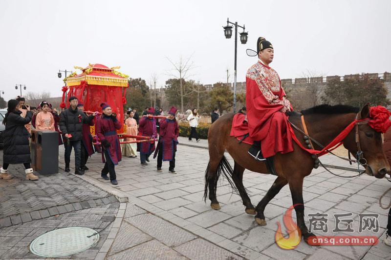 昨日上午,在商丘古城内,新郎骑马在前,新娘乘轿在后,一场喜庆的传统婚礼吸引了不少游客的目光。1月18日正值腊八节,当喜庆的传统婚礼与腊八节相遇在一起,也是对传统文化的传承和弘扬。本报融媒体记者 魏文慧 摄
