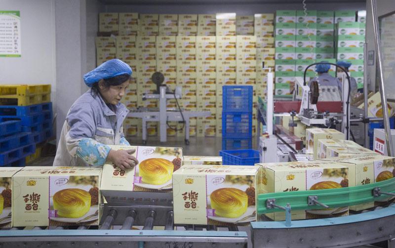 1月21日,工人在面包生产线上忙碌着。永城市麦客多食品有限公司拥有国际先进水平食品生产线12条,拥有“麦客多”“咔丽滋”“零零豆”等知名品牌,年销售收入4.6亿元。 本报融媒体记者 崔 坤 摄