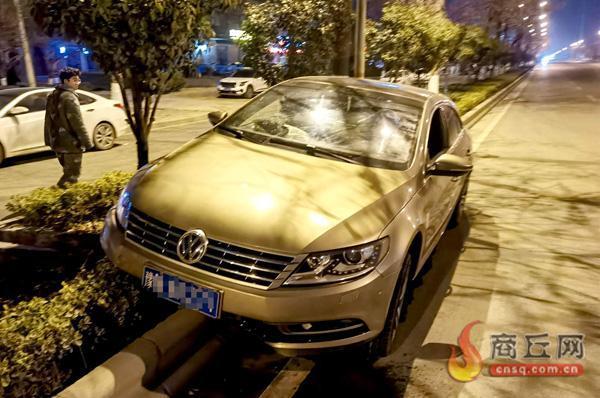 1月28日,在民主路与平原路交叉口附近,一辆私家车“骑”在了绿化带上,十分危险。春节临近,路上车辆增多,开车一定要注意安全。记者 魏文慧 摄