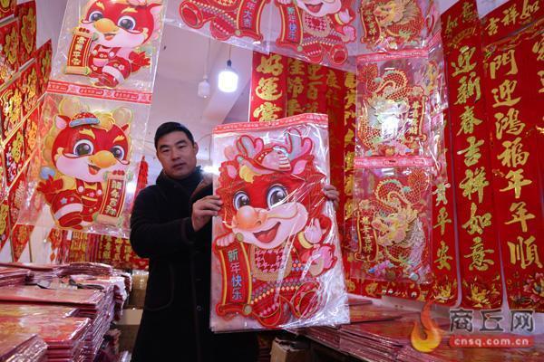 1月29日,归德南路一饰品店的店主展示以“龙元素”为主的新年饰品。随着龙年春节越来越近,春联、门画、中国结等春节装饰品纷纷上架,其中“龙元素”饰品吸引了许多市民前来选购。 记者 邢 栋 摄