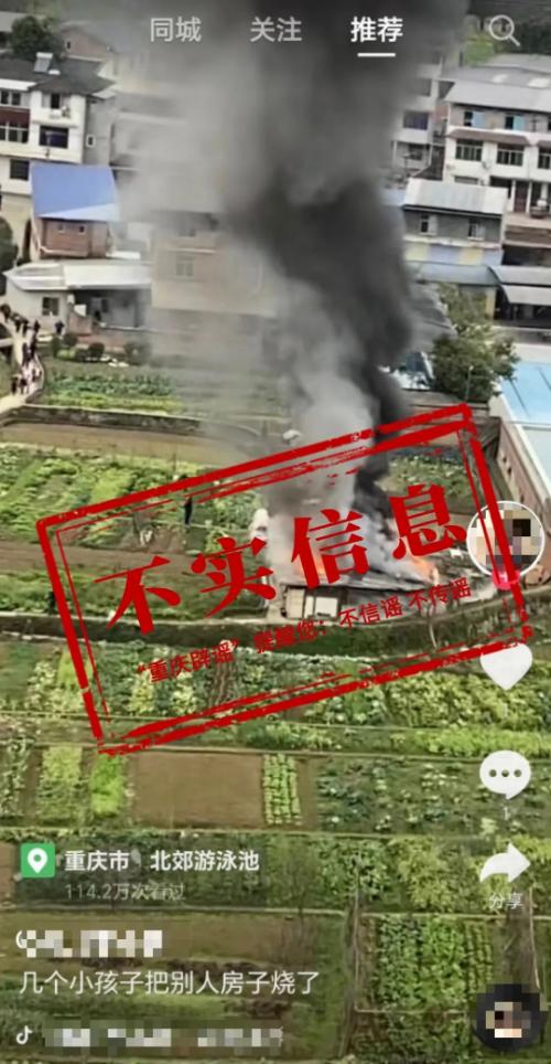 该视频IP定位为“重庆市北郊游泳池”,画面显示一民房处于着火状态,并配音称“4个小孩将民房点燃,然后从现场逃离”。