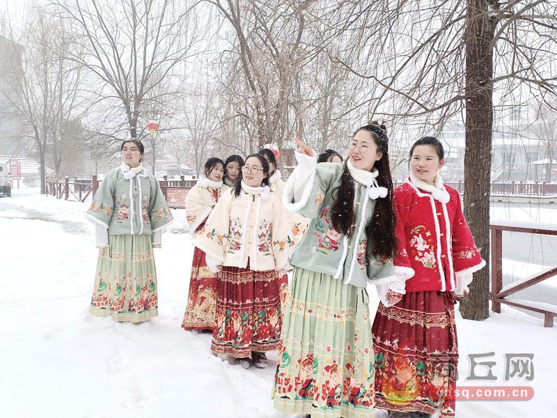 2月5日,游客身穿汉服在民权县花园乡赵洪坡民俗文化村踏雪赏景。春节前夕,该村进一步盘活民俗文化资源,组织开展了“观民俗、农耕体验、汉服体验”等一系列春节多彩民俗活动,让年味儿更浓,让游客获得感、幸福感更强。