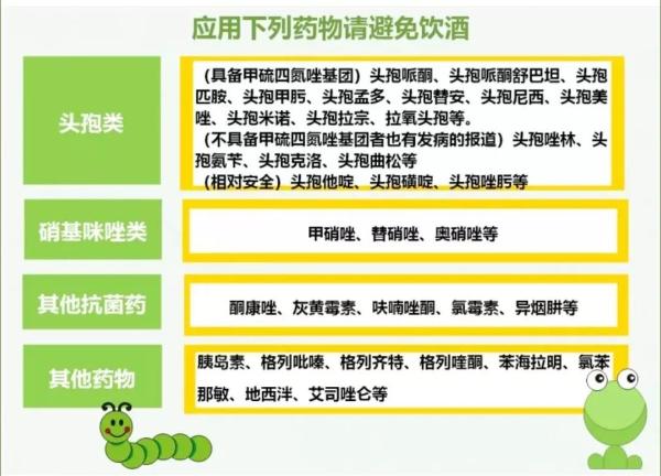 此外,许多药物具有与双硫仑相似的作用,用药后若饮酒,会发生面部潮红、眼结膜充血、视觉模糊、头颈部血管剧烈搏动或搏动性头痛、头晕,恶心、呕吐、出汗、口干、胸痛、心肌梗塞、急性心衰、呼吸困难、急性肝损伤,惊厥及死亡等。
