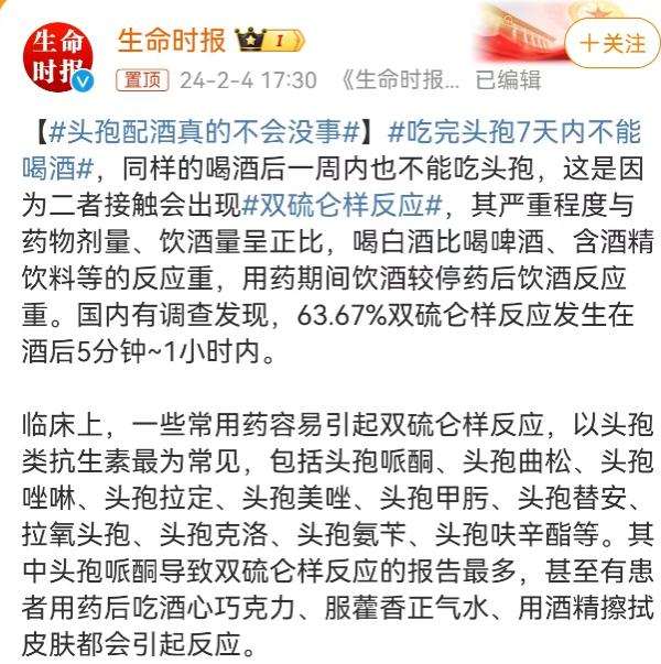 对此,生命时报官方微博发文称,吃完头孢7天内不能喝酒,同样的喝酒后一周内也不能吃头孢,这是因为二者接触会出现双硫仑样反应,其严重程度与药物剂量、饮酒量呈正比,喝白酒比喝啤酒、含酒精饮料等的反应重,用药期间饮酒较停药后饮酒反应重。国内有调查发现,63.67%双硫仑样反应发生在酒后5分钟~1小时内。