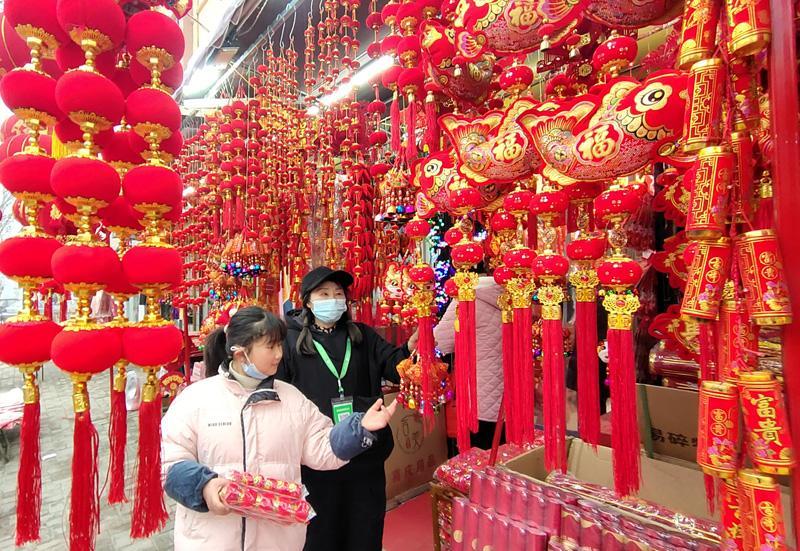 (上图为市民在挑选新春饰品。吕忠箱 摄)
