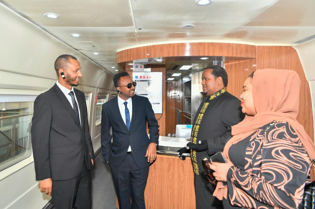 2023年11月7日,首届亚吉铁路高层管理人员培训在天津铁道职业技术学院举行结业仪式。这是结业人员在高铁模拟车厢内交谈。