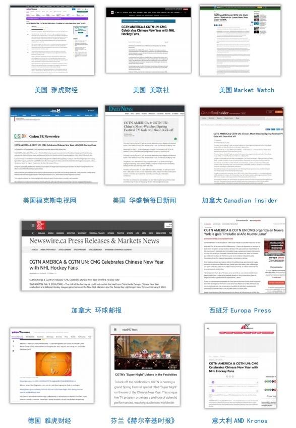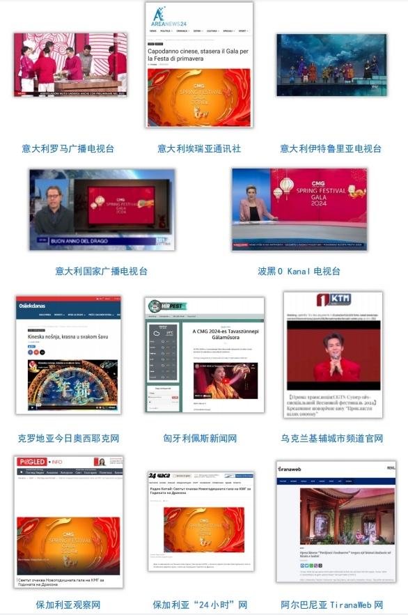 总台通过68种语言传播平台快速编译播发多语种特稿《“人民的春晚”伴全球受众共迎龙年新春》,重点推介《年锦》《别开生面》《健康到到令》《永恒的诗篇》等包括舞蹈、杂技、武术、戏曲等具有浓郁中国特色的春晚精彩节目,彰显中国传统文化的独特魅力。相关报道被美国雅虎财经、NBC、美国商业新闻网Market Watch、美国知名商务资讯媒体Seeking Alpha,德国雅虎,加拿大环球邮报、Canadian Insider,意大利国家广播电视台、ADN Kronos,芬兰《赫尔辛基时报》,西班牙Europa Press,雅虎日本、每日新闻网,巴西247新闻网、《伯南布哥日报》,波兰《论坛报》,匈牙利佩斯新闻网,克罗地亚奥西耶克网,塞尔维亚Happy TV电视台,黑山亚得里亚电视台,保加利亚“24小时”网、观察网,黑山Mediabiro视频通讯社,韩国《中央日报》,印度亚洲新闻社、新方向网,土耳其Fuar新闻网,马来西亚马中透视网,菲律宾CNTV脸书,柬埔寨亚洲热点新闻网、柬中记协网,斯里兰卡lankaplusnews,泰中新闻网,缅甸Opinion Leaders,印度Business Today India,巴基斯坦Daily Gulf News,伊朗经济学家网,阿富汗明月台官网,孟加拉国今日电台,蒙古国Mongoltur新闻网,尼泊尔都市在线网,斯里兰卡头条新闻网,尼日利亚《领导者报》等海外主流媒体广泛播发转载。