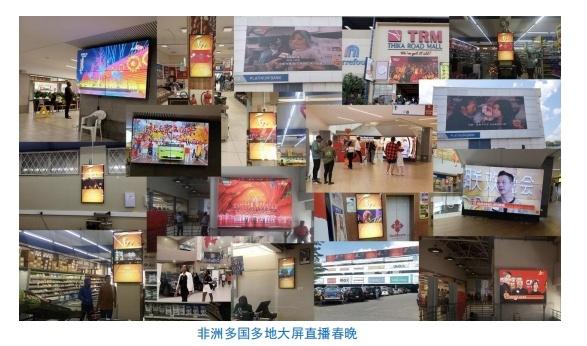 全球各大洲49个国家、90座城市的3285块公共大屏直播、宣介总台春晚。阿联酋迪拜购物中心、南非曼德拉广场、开普敦运河中心、肯尼亚内罗毕繁华商业区、埃塞俄比亚东方工业园、卢旺达首都基加利、坦桑尼亚首都达累斯萨拉姆等地多块海外地标性大屏直播春晚节目,与世界分享中国年的欢腾与喜悦。
