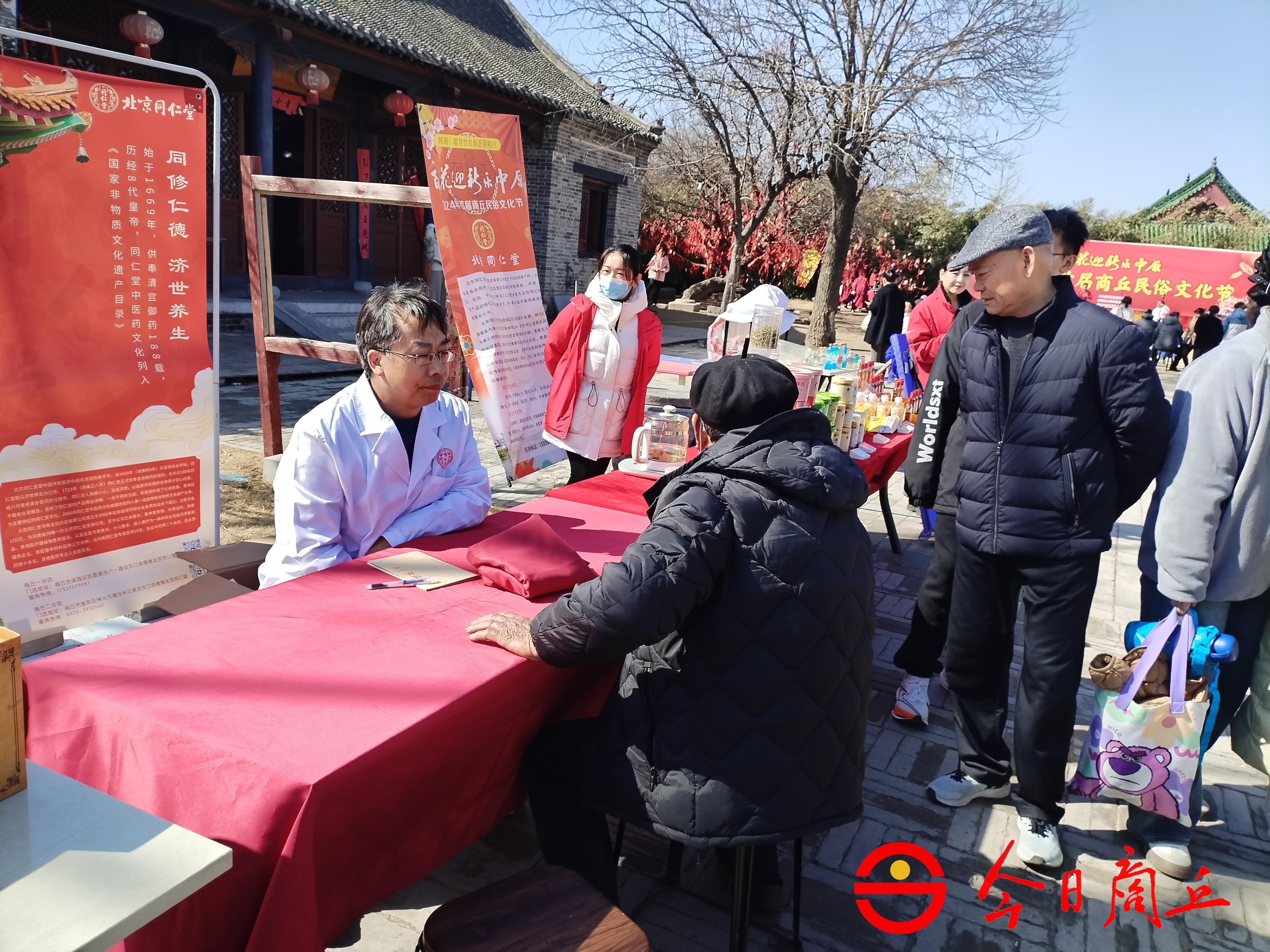当天,邀请到了北京同仁堂商丘药店、郭老道正骨堂、曜艾堂等三家老字号的中医专家为广大市民、游客进行现场义诊。