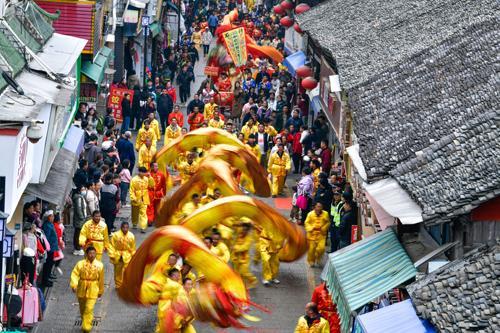 2月20日,人们在贵州省石阡县仡佬毛龙节上参加毛龙巡游。当日,贵州省石阡县举办“龙腾盛世·锦绣阡城”为主题的仡佬毛龙节贺新春活动,来自全县各乡镇的近百支毛龙队、花灯队齐聚石阡县城,举行毛龙巡游、毛龙点睛、舞龙大赛等活动,欢庆毛龙节,喜迎新春。