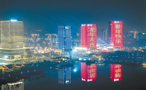 市区一处写字楼LED亮化屏上显示着“新年快乐”“龙年大吉”字样。