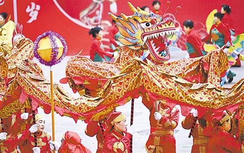 2月20日,在宁夏银川市,参赛社火队的演员为市民表演舞龙。当日,宁夏银川市社火联赛首场比赛在兴庆区光明广场举行。来自银川市兴庆区、贺兰县的多支社火队为市民献上秧歌、舞龙、舞狮等传统社火项目,喜迎元宵佳节的到来。