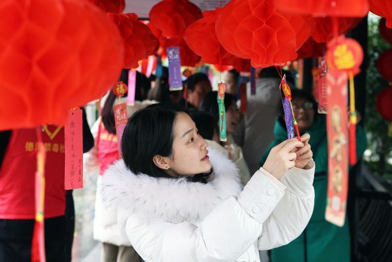 2月22日,在浙江省湖州市德清县乾元镇法治长廊,居民参与法治知识为主题的猜灯谜活动。 新华社发 倪立芳 摄