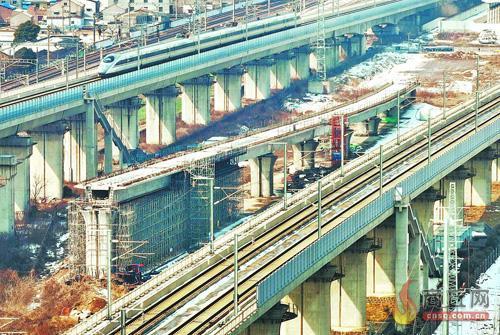 2月26日,在睢阳大道与郑徐高铁交会处附近,高速列车从建设中的商丘动车存车场轨道旁经过。