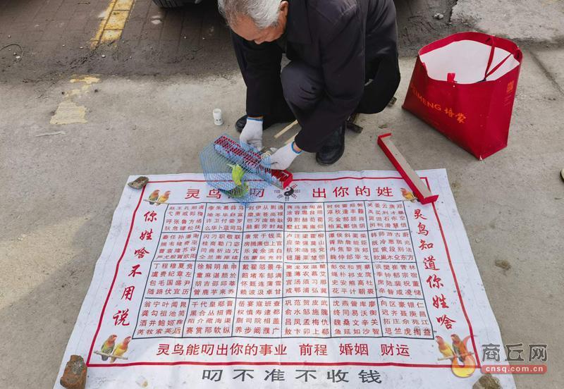 2月27日上午,在文化路旁一家菜市场门口,摆摊的老者称,灵鸟嘴一叼,就能够算出姓氏、婚姻、财运,一次5块钱。记者提醒市民,遇到这种事儿,看看热闹就行了,千万可别当真。
