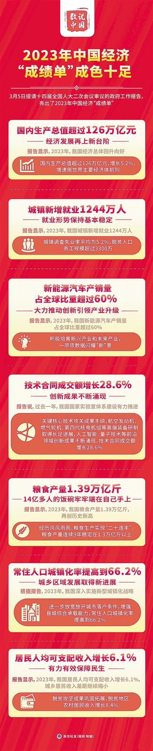 报告显示,2023年,我国经济总体回升向好。国内生产总值超过126万亿元,增长5.2%,增速居世界主要经济体前列。“中国经济长期向好的基本面与光明前景毋庸置疑。”全国政协委员、中央党校(国家行政学院)教授韩保江说。