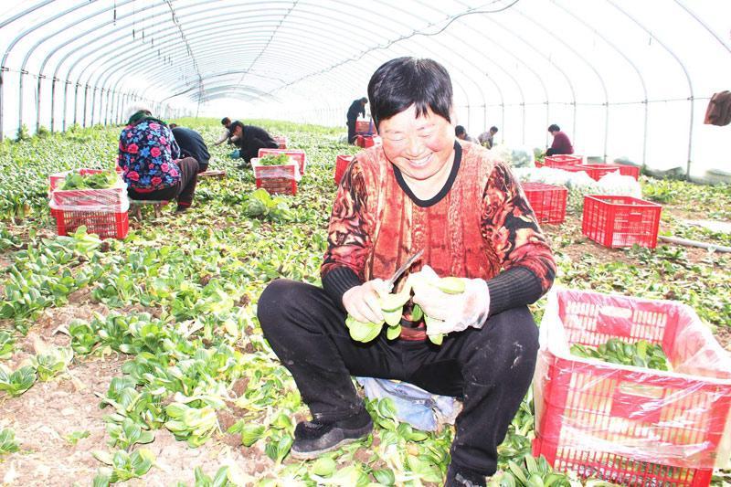 “俺把孙儿送到学校就来这里干活,采收一筐五块钱,一天最少能割十几筐菜,干完就能拿到钱,挣了零花钱还不耽误照顾家里。”手里不停歇的村民王敬玲熟练地将刚薅出来的小青菜去泥除根,说话间,一颗颗小青菜就被整齐地码进塑料筐内。