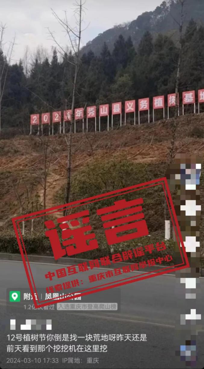 真相:近日,有网传信息称,重庆市秀山县凤凰山公园“把原有树木挖了办3月12日植树节”。经核实,该信息不实。当地相关部门表示,秀山县2024年义务植树选址在秀山县凤凰山传灯寺南行500米处,该地块属秀山县国有轿子顶林场管辖林地,总面积约7亩,原地块状态为灌木林地,杂草杂冠丛生。图片所述情形,是在将原有杂草杂冠清理,重新清林整地打窝,栽植香樟树,以提升森林质量,改善生态环境,保护生物多样性。(来源:“重庆辟谣”微信公众号)
