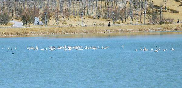 成群结队的天鹅在睢阳古城外的护城河中休憩 高 敏 摄