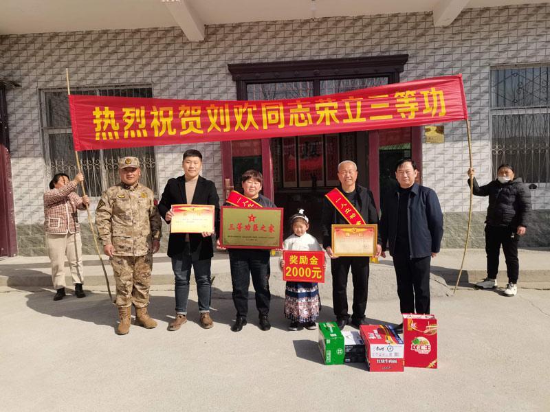 一人立功,全家光荣。近日,梁园区刘口镇相关负责人带着“三等功臣”奖匾、2000元慰问金和慰问品,前往该镇坡刘和庄村云南武警总队昆明中队中队长刘欢家中送喜报。 这次活动受到一致好评,这不仅是对刘欢在服役期间卓越表现和重大贡献的高度肯定,而且营造了拥军优抚氛围,激发了适龄青年参军报国的热情。 本报融媒体记者 李岩 通讯员 赵晨淇 摄