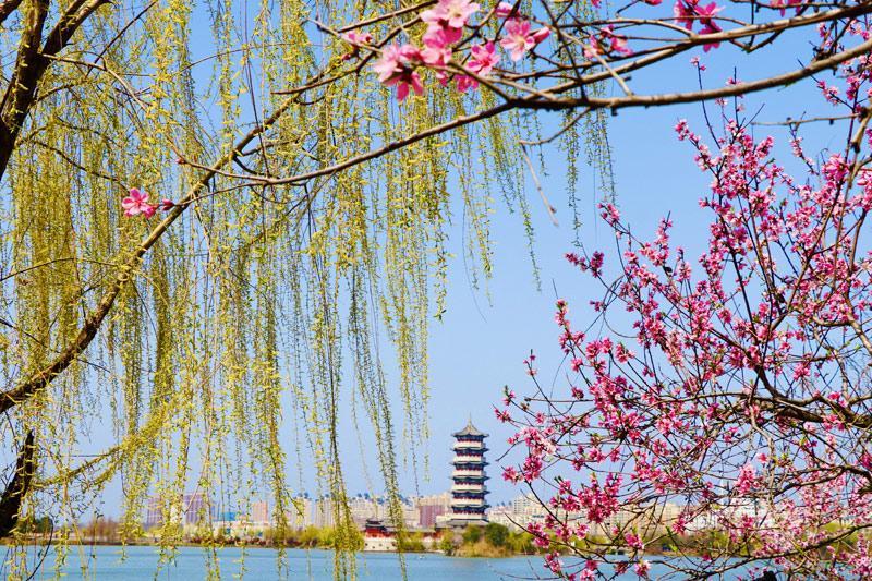 近年来,柘城县树立“生态优先、绿色发展”理念,不断加强生态环境保护力度,推进城市生态公园建设,生态环境持续向好。图为3月19日,柘城县千树园景区杨柳依依、鲜花盛开,吸引市民游园赏花。 张书珲 摄
