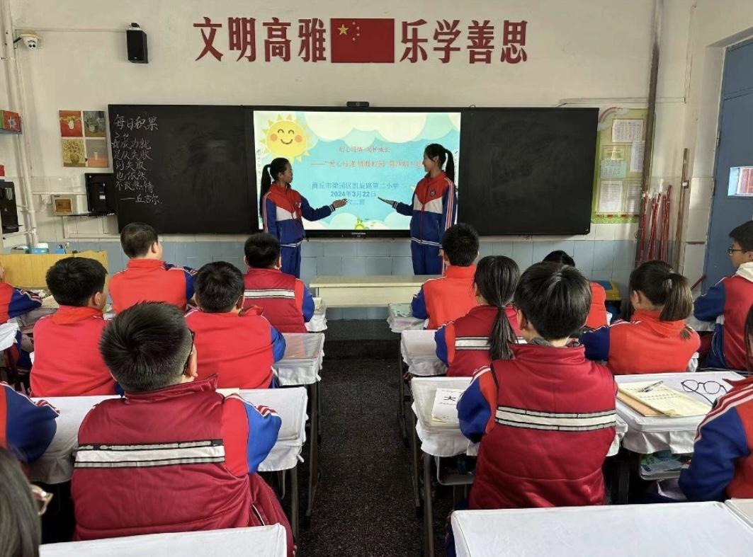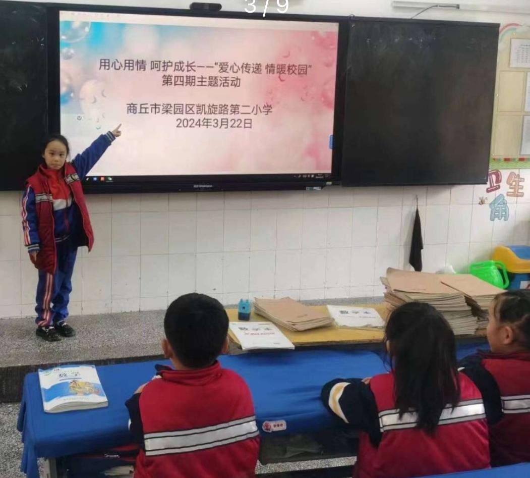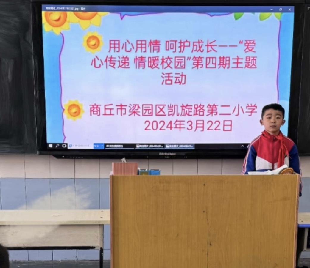 为了全面提高学生心理健康素质,营造积极、健康、和谐的心理健康教育氛围,引导学生树立正确的心理健康观念,更好地帮助学生解决学习和生活中遇到的一些心理困惑,3月22日,商丘市梁园区凯旋路第二小学开展了主题为“用心用情,呵护成长”第四期“爱心传递,情满校园”心理健康教育主题班会。