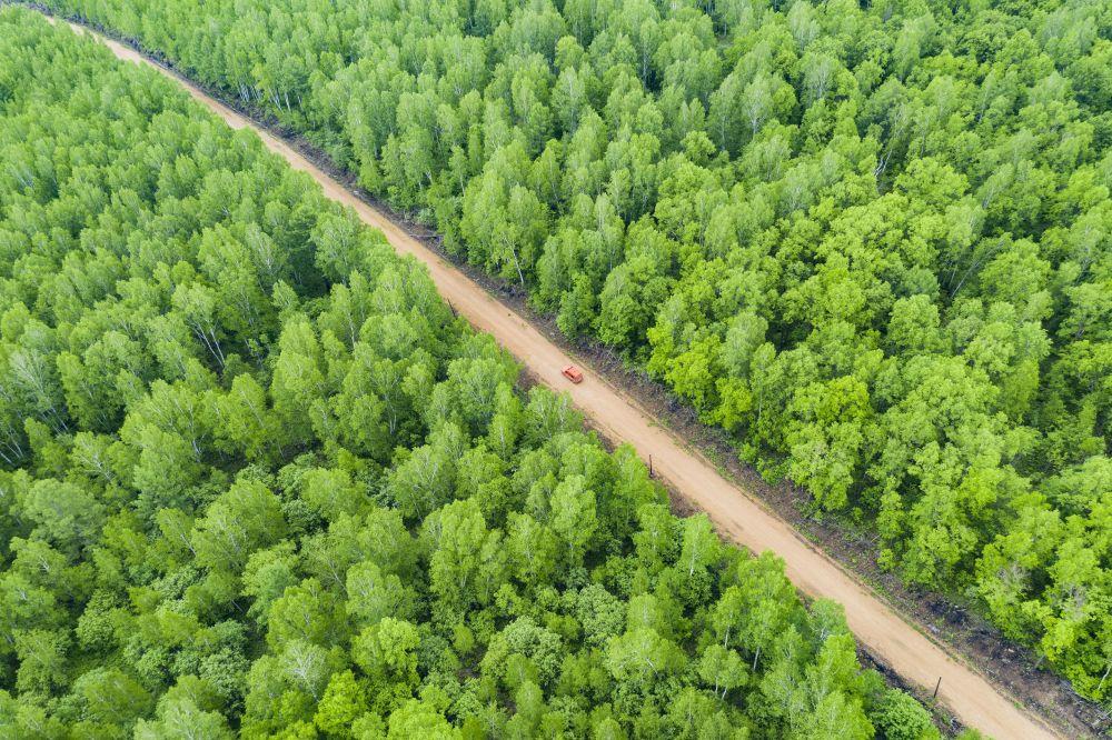 ↑2021年6月4日,在伊春森工乌伊岭林业局有限责任公司阿廷河林场分公司施业区,护林员驾车进行森林巡护(无人机照片)。