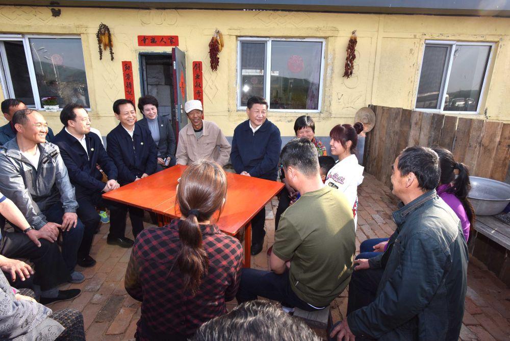 ↑2016年5月23日下午,习近平在伊春上甘岭林业局溪水经营所林场职工刘养顺(左五)家,同一家人和邻居们亲切交谈。