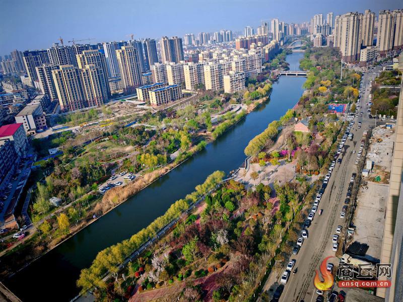 4月1日,市区周商永运河水质清澈,两岸花开正艳,与河边建筑交相辉映,宛如一幅画卷。