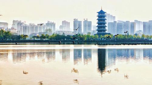 4月7日,柘城县容湖国家湿地公园旭阳初照,薄雾缭绕,湖面上鹭鸟飞舞,景色一新。近年来,该县致力打造高品质城市绿化空间,让群众享受到自然、和谐、生态的园林绿化建设成果。张子斌 摄