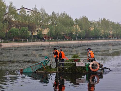 4月9日,城区包河(中州路至归德路路段),工作人员正在清理水草。近年来,我市认真践行“绿水青山就是金山银山”的理念,坚持生态优先、绿色发展,扎实推进河长制,实现治水护水全覆盖,描绘出一幅“河畅、水清、岸绿、景美”的生态画卷。本报融媒体记者 邢栋 摄