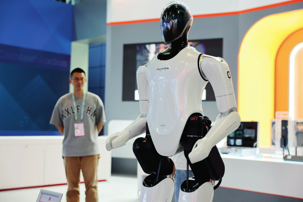 位于中关村国家自主创新示范区展示中心的一款全尺寸人形仿生机器人(2023 年 5 月 26 日摄)张晨霖摄 / 本刊