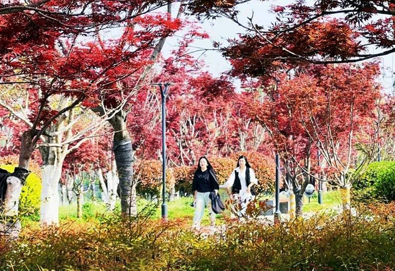 4月12日,日月湖景区红枫岛栽种的红枫红了,热情似火地欢迎来访市民,引得市民驻足观赏。据了解,红枫岛总面积1100平方米,共栽种红枫770余棵。