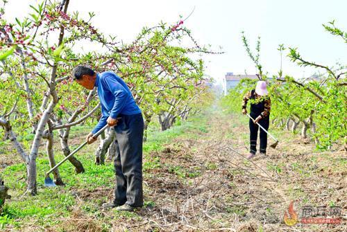 4月13日,在夏邑县郭店镇王刘庄村桃园,朵朵盛开的桃花在阳光的照耀下,争奇斗艳。十几名当地脱贫户村民,在春色怡人的桃园辛勤劳作,桃林深处不时传来阵阵笑声。 本报融媒体记者 韩 丰 张壮伟 摄