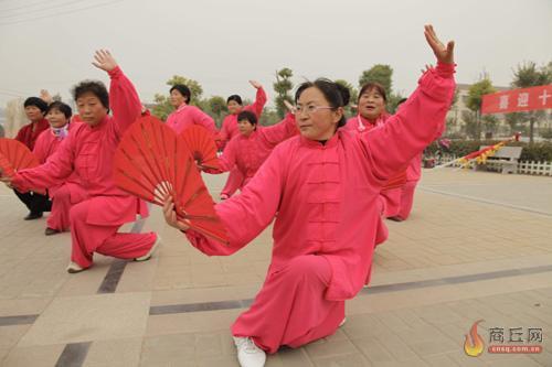 4月13日,虞城两河口公园内,几位市民在练习扇子舞。据了解,这些跳舞的市民年龄都在60岁左右,她们经常聚在一起编排舞蹈。 谢卫勋 摄