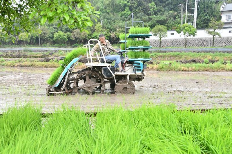 △暮春时节,各地农民抢抓农时开展农事活动。图为2024年4月12日,在浙江建德市寿昌镇河南里村农田里,农机手驾驶插秧机插种秧苗。