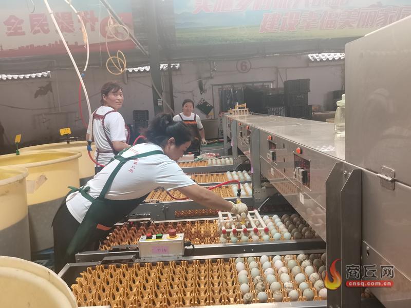 4月16日,睢县白庙乡徐阳沟村河南省赣豫农业发展有限责任公司工人正在加工鸭蛋。该企业主要生产松花蛋、咸鸭蛋、烤鸭蛋等产品,实现链条化、标准化、精细化和智能化生产,日加工鸭蛋70万枚,年销售金额1.5亿元。二期配套设施正在安装,预计投产后,该企业可日加工鸭蛋300万枚,年产值10多亿元,增加就业岗位100多个。
