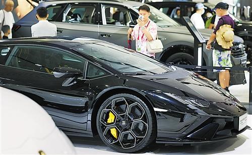 ③:4月17日,观众在第四届消博会上拍摄兰博基尼汽车。 新华社记者 杨冠宇 摄
